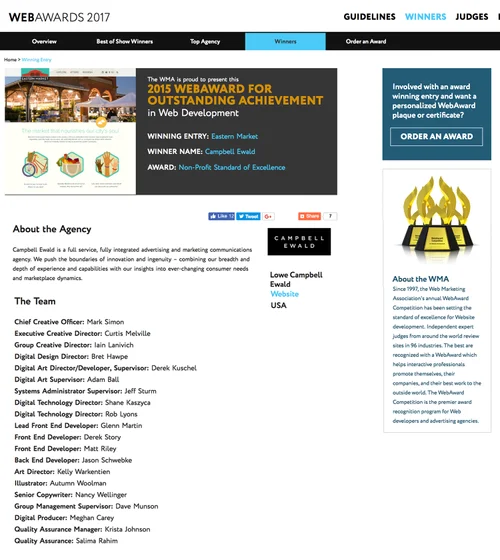 One of my most cherished projects will forever be the collateral pieces I designed for Eastern Market. Campbell Ewald had the honor of rebranding the historic market with a complete redesign. With this redesign we were able to win a WEBAWARD for Outstanding Achievement in Web Development.